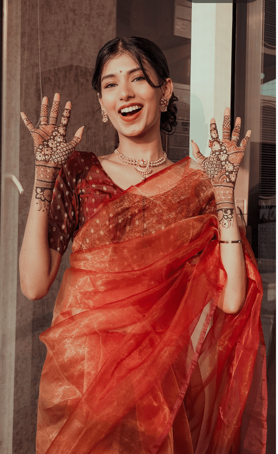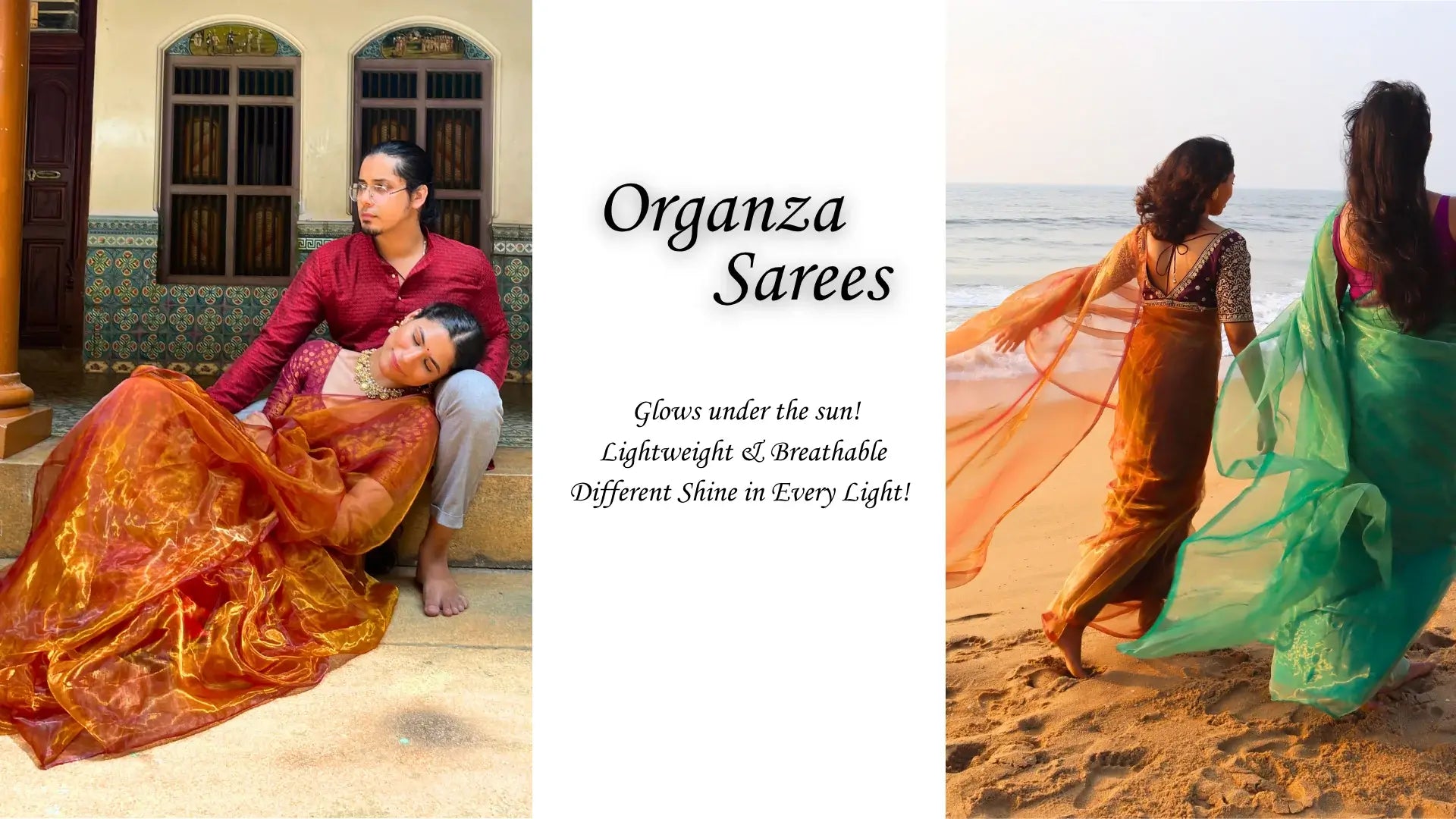 Our collection includes glowing organza sarees, rich banarasi sarees, fluid satin sarees, light linen tissue sarees, and stunning festive sarees — each crafted for weddings, farewells, and everyday grace. We also make inclusive free size dresses with pockets, kaftan dresses, and maternity styles.