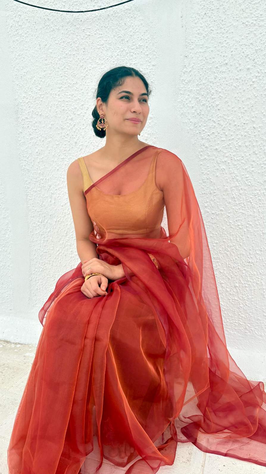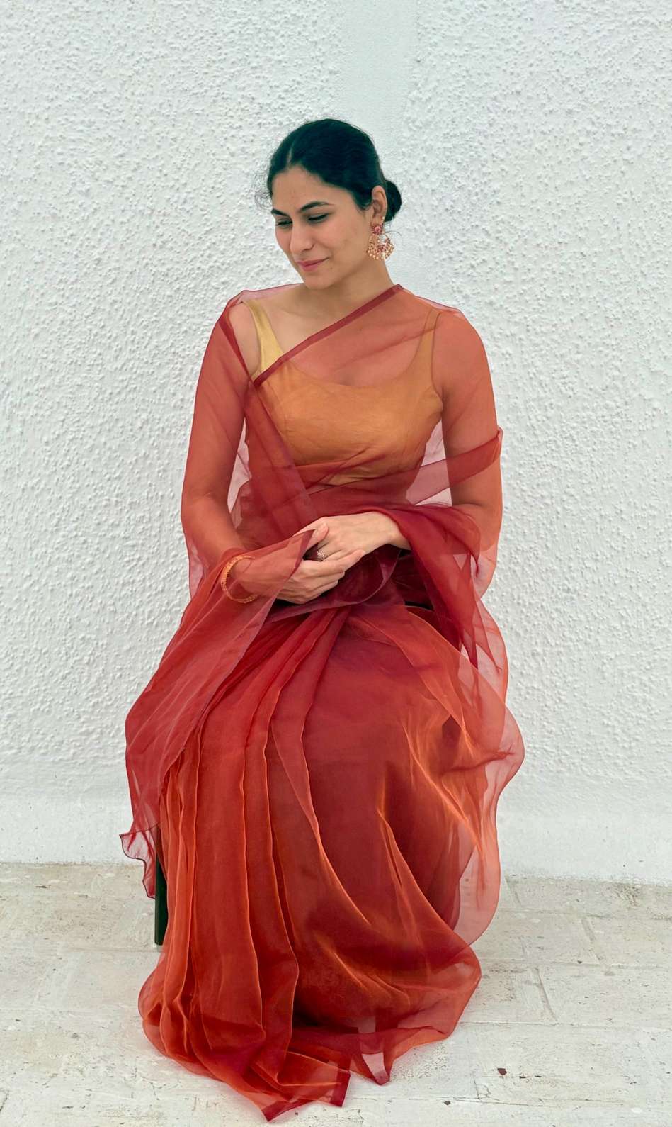 Woman in a blood red organza saree with gold jewelry sitting outdoors.