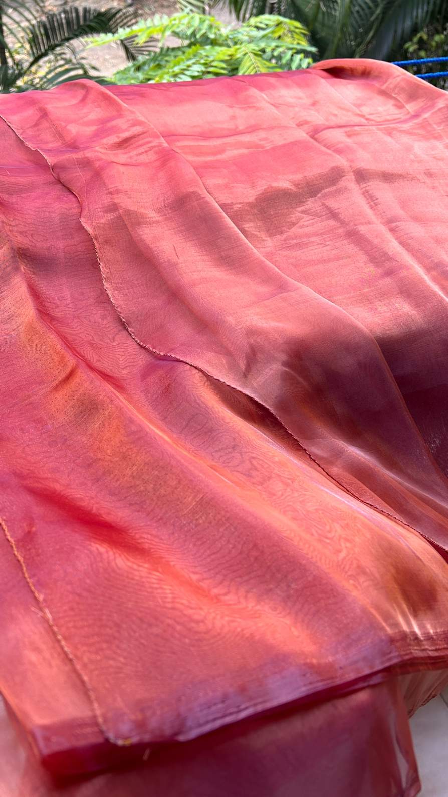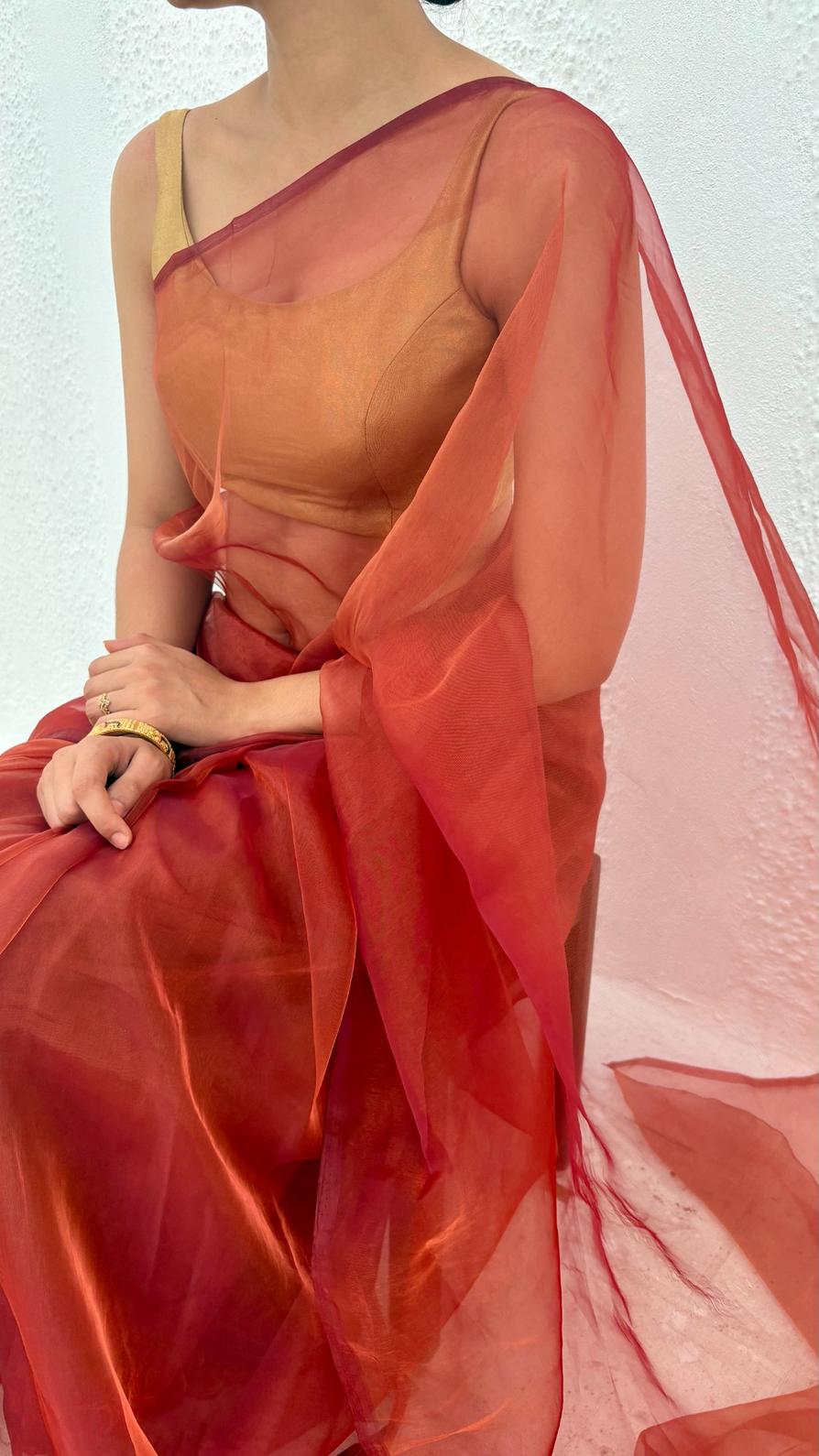 Organza and tissue sarees are naturally sheer and lightweight. We recommend pairing them with a matching blouse and underskirt/petticoat for comfortable coverage.