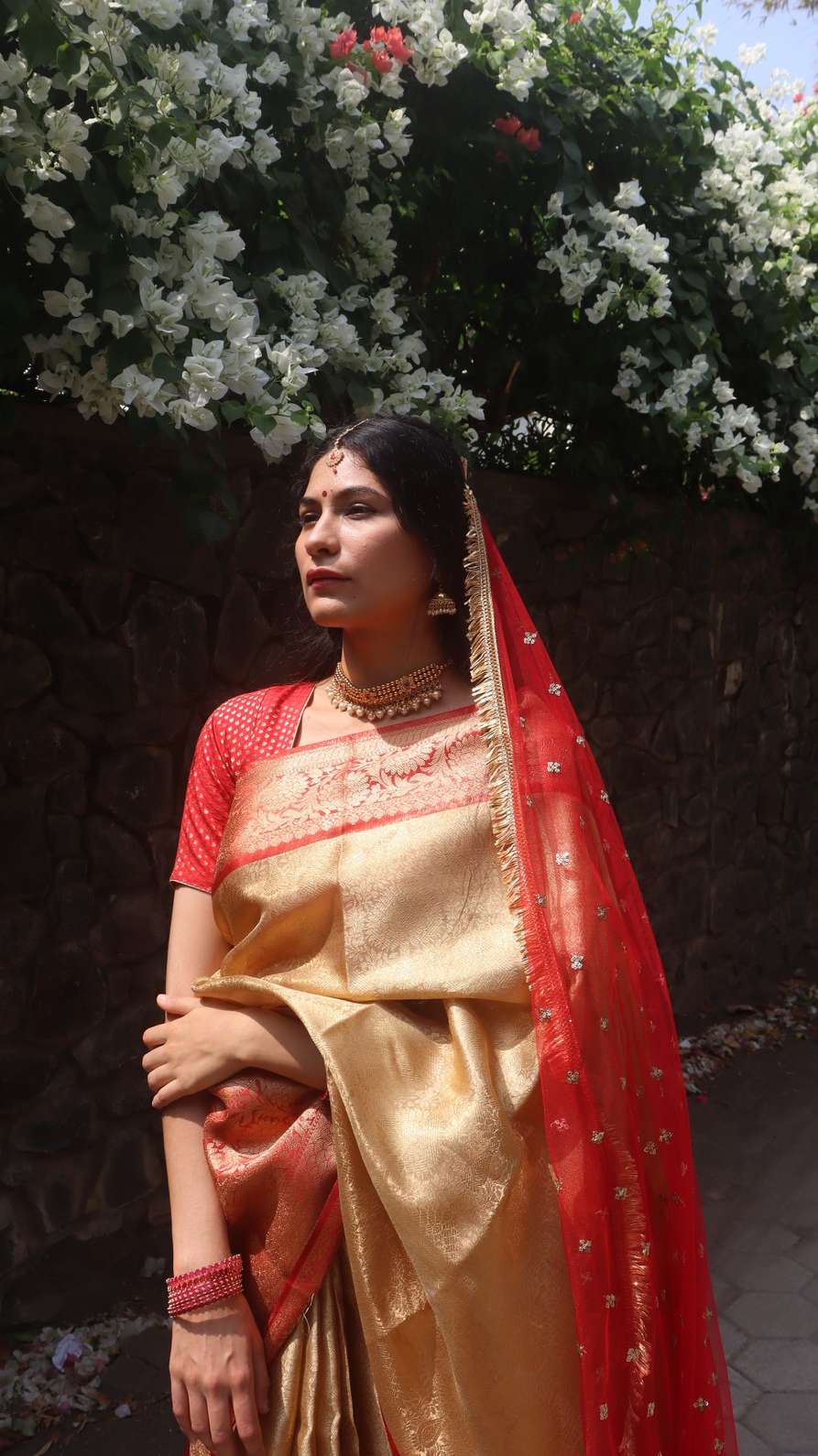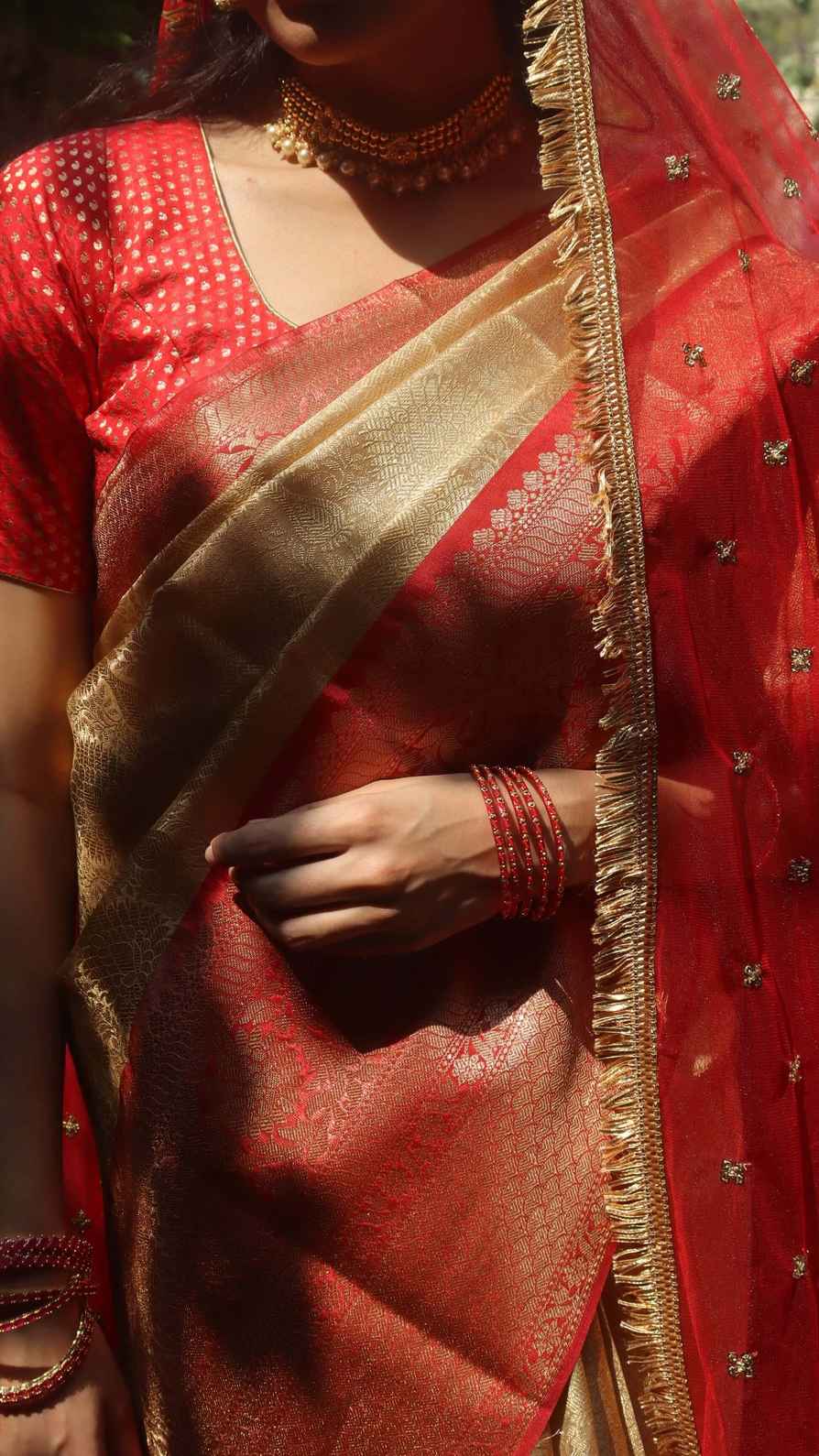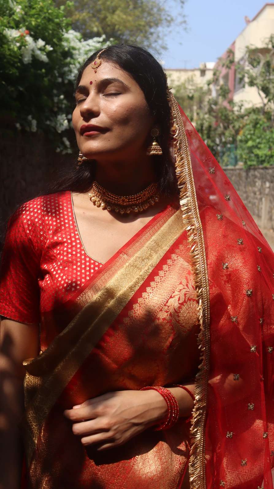 Woman in a blood red organza saree with gold jewelry sitting outdoors.