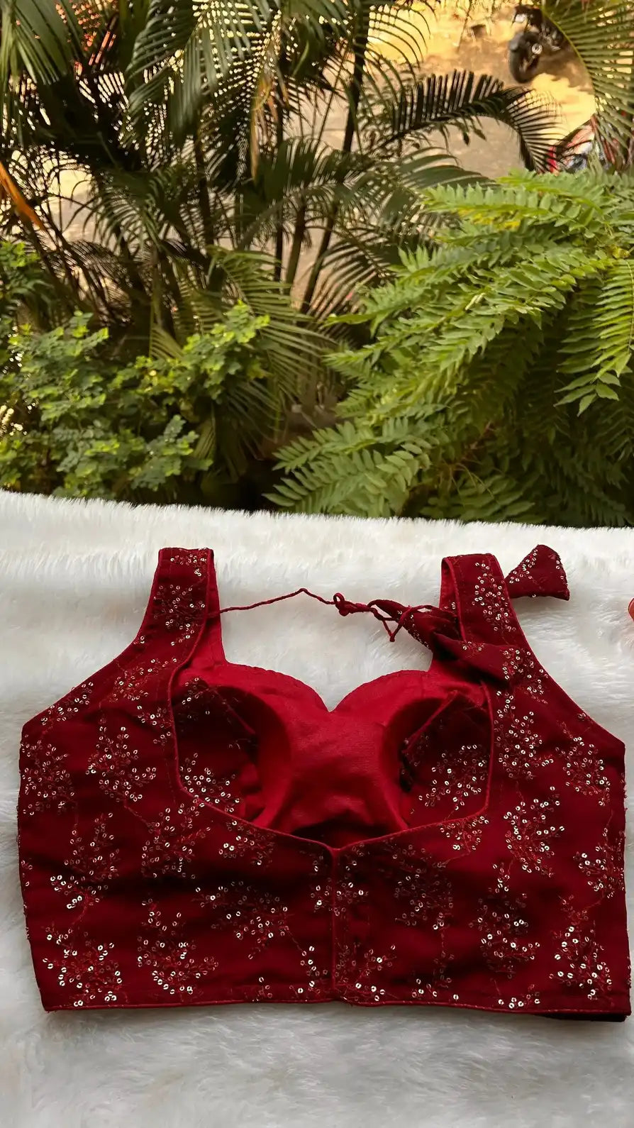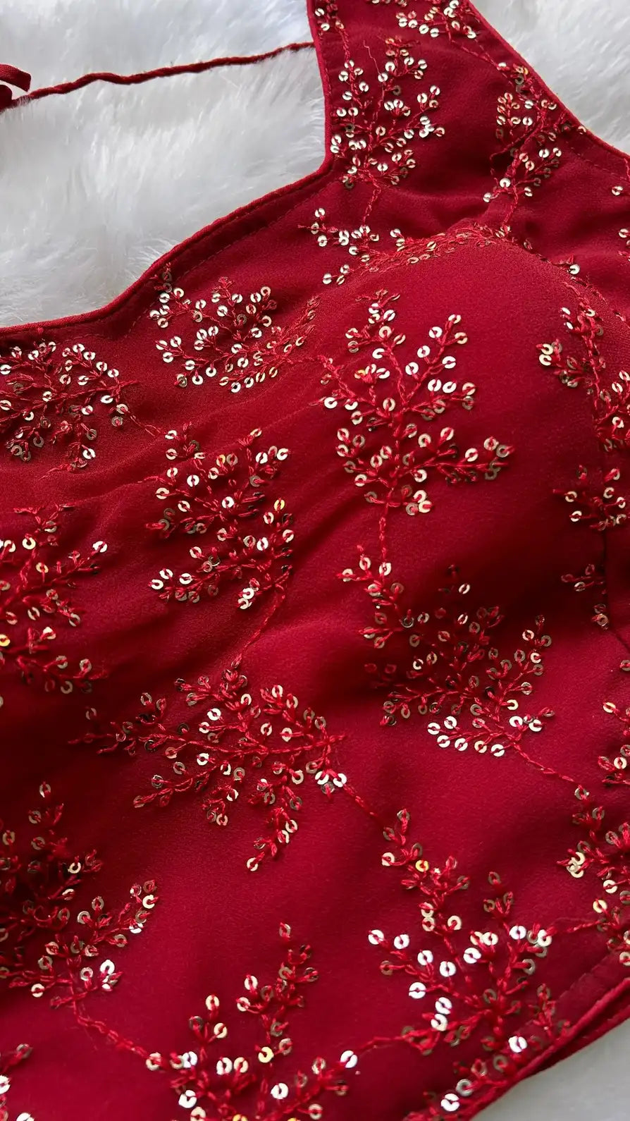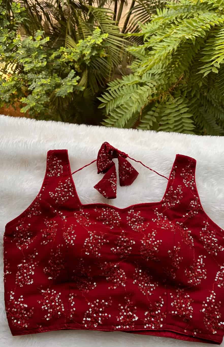 Mit unserer Noor-e-Gulab Bluse ziehen Sie in dieser festlichen Jahreszeit alle Blicke auf sich – eine tiefrote Partybluse, die klassische Eleganz mit modernem Glamour vereint. Verziert mit zarter Fadenstickerei in passendem Kastanienbraun und verstreuten Pailletten, die bei jeder Bewegung das Licht einfangen, ist diese Bluse der perfekte Begleiter für Hochzeiten, Cocktailabende oder festliche Zusammenkünfte.