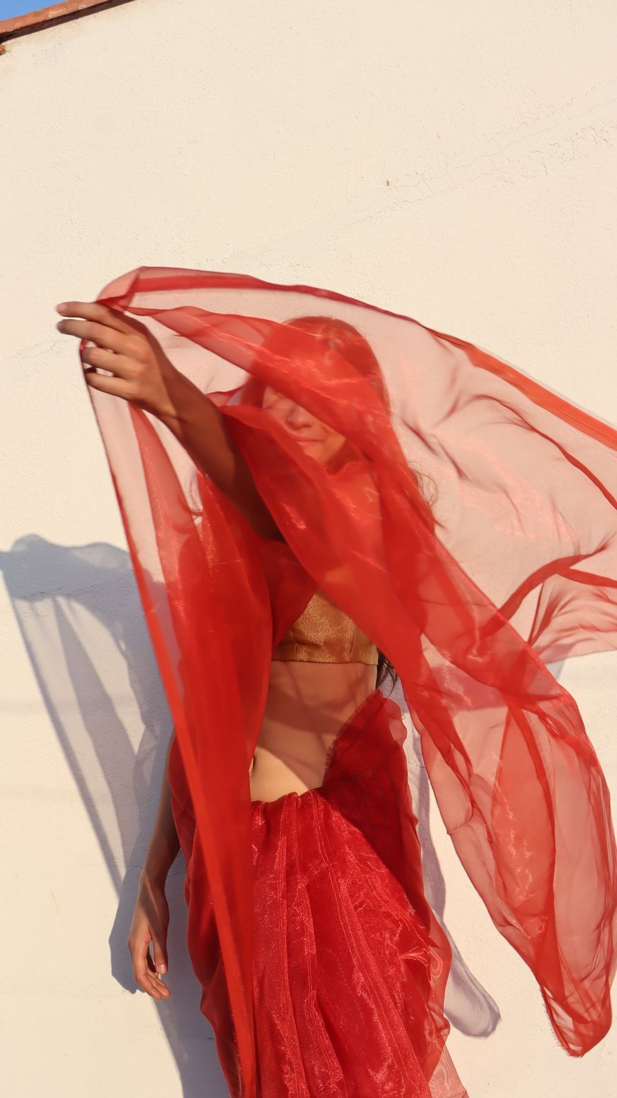A striking scarlet red that commands attention. The saree glows with luminous undertones that shift with the light, appearing vibrant and radiant in daylight, while transforming into a deeper, richer red under evening lights. The sheer organza adds dimension and softness, creating a beautifully dramatic effect with every drape.
