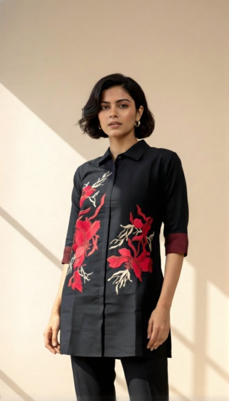 The Black Iris Co-Ord Set is made for quiet confidence and strong first impressions. Set against a deep black base, bold red floral embroidery adds just the right amount of drama — striking, refined, and unmistakably modern.