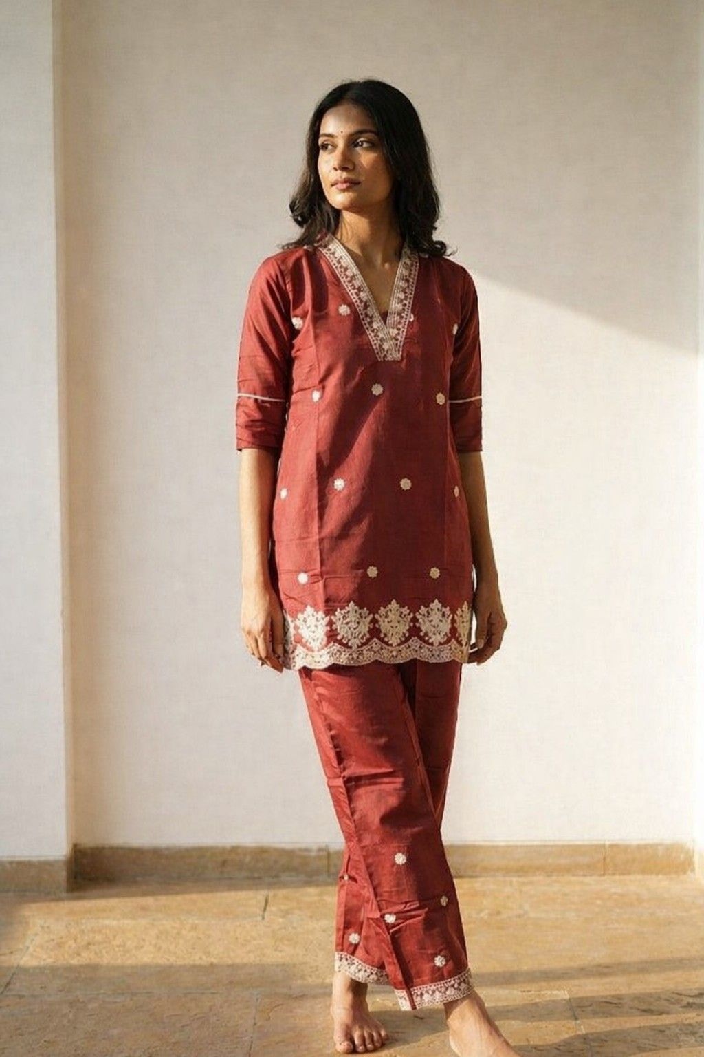 The Earthen Muse co-ord set is rooted in warmth and quiet elegance. Crafted in a rich rust tone, this set features a relaxed kurta paired with matching pants, brought together with delicate embroidery that adds just the right amount of detail without overpowering the look.