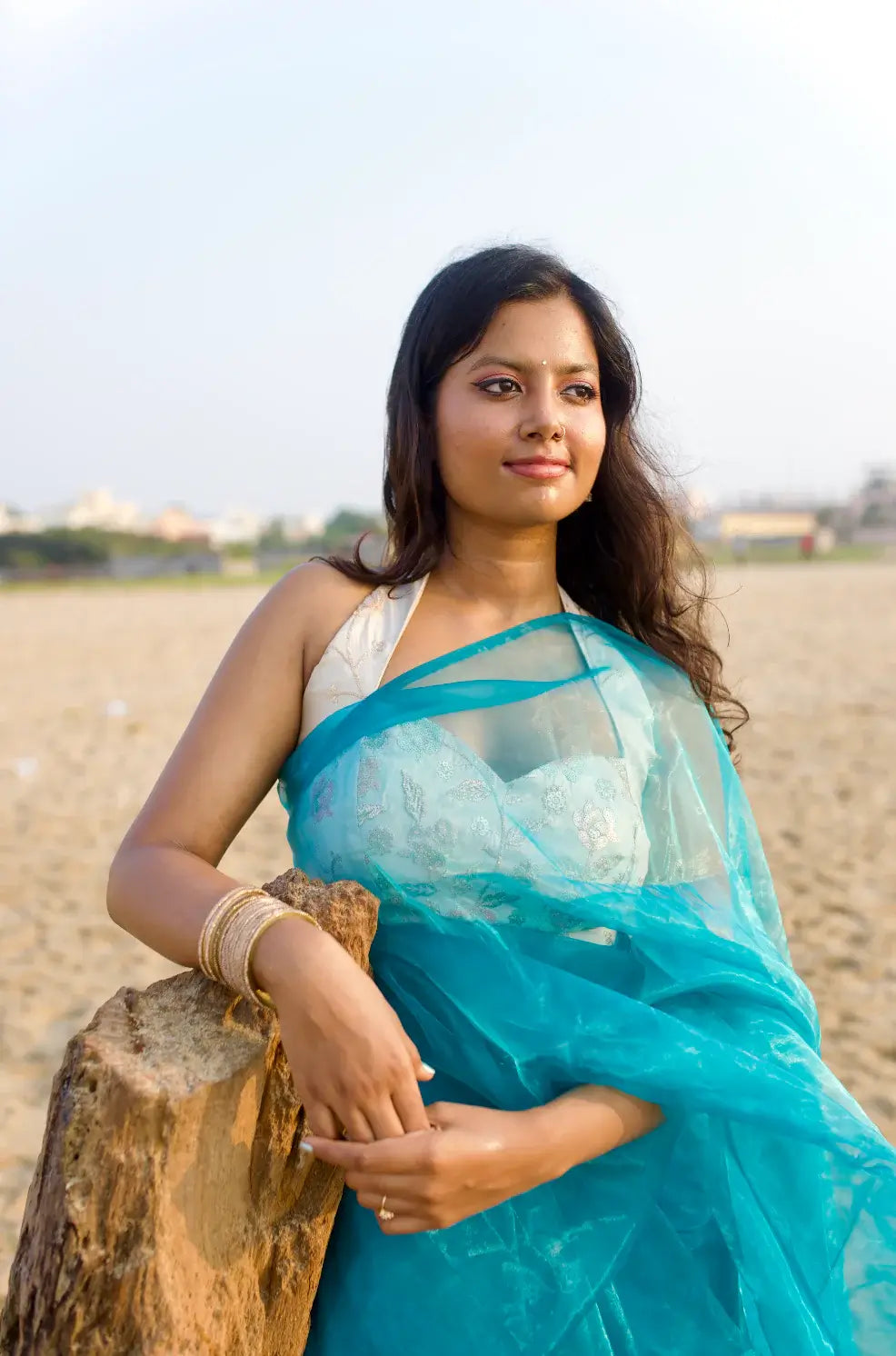 Woman in a blue saree standing on a beach