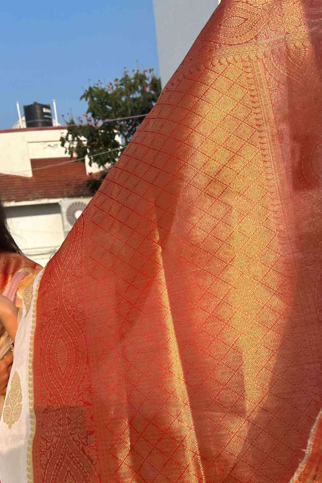 Sari en organza Banarasi blanc et rouge : une collection Anaira de luxe