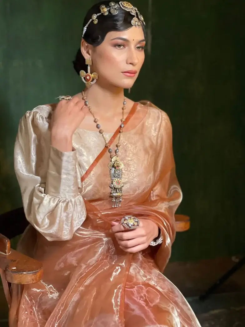 Organza and tissue sarees are naturally sheer and lightweight. We recommend pairing them with a matching blouse and underskirt/petticoat for comfortable coverage.