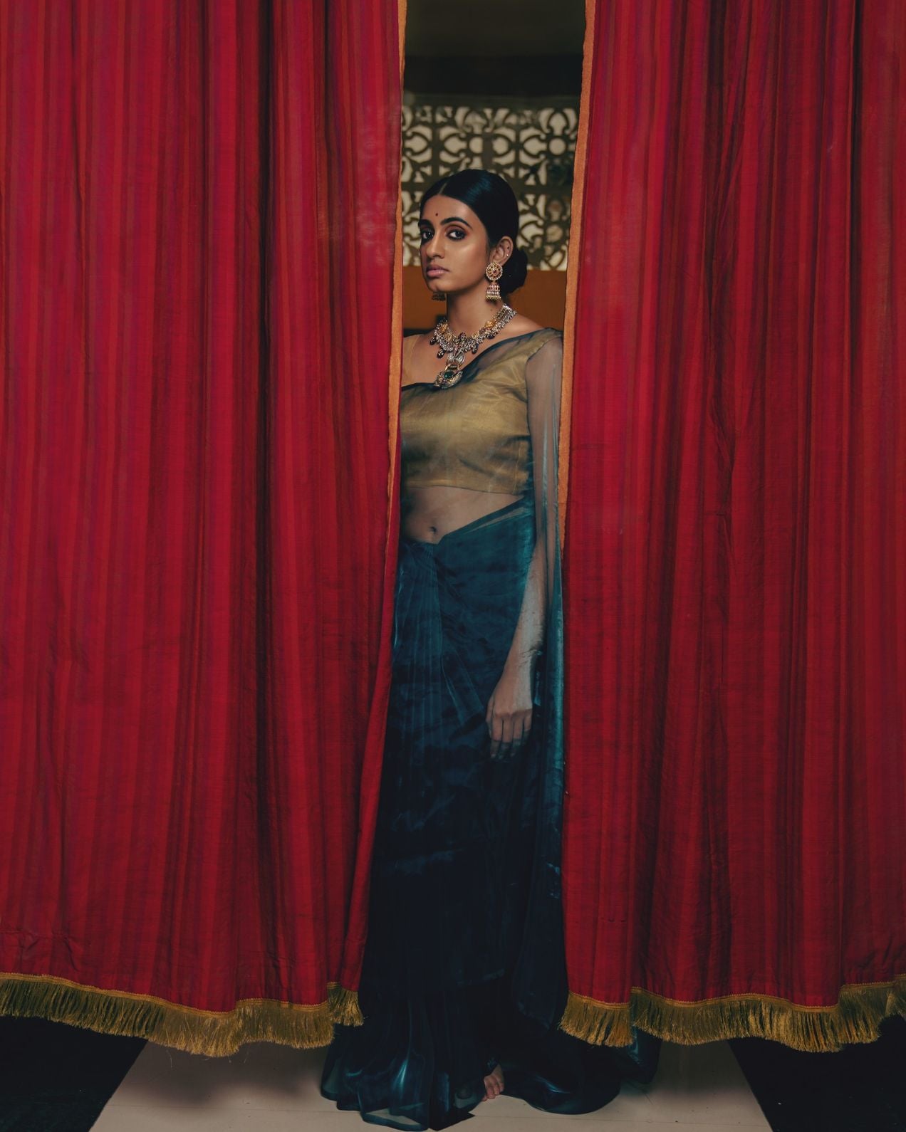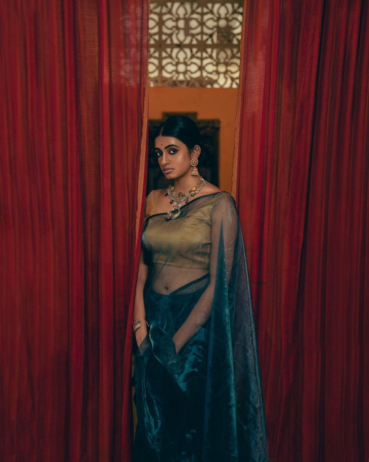 Organza and tissue sarees are naturally sheer and lightweight. We recommend pairing them with a matching blouse and underskirt/petticoat for comfortable coverage.