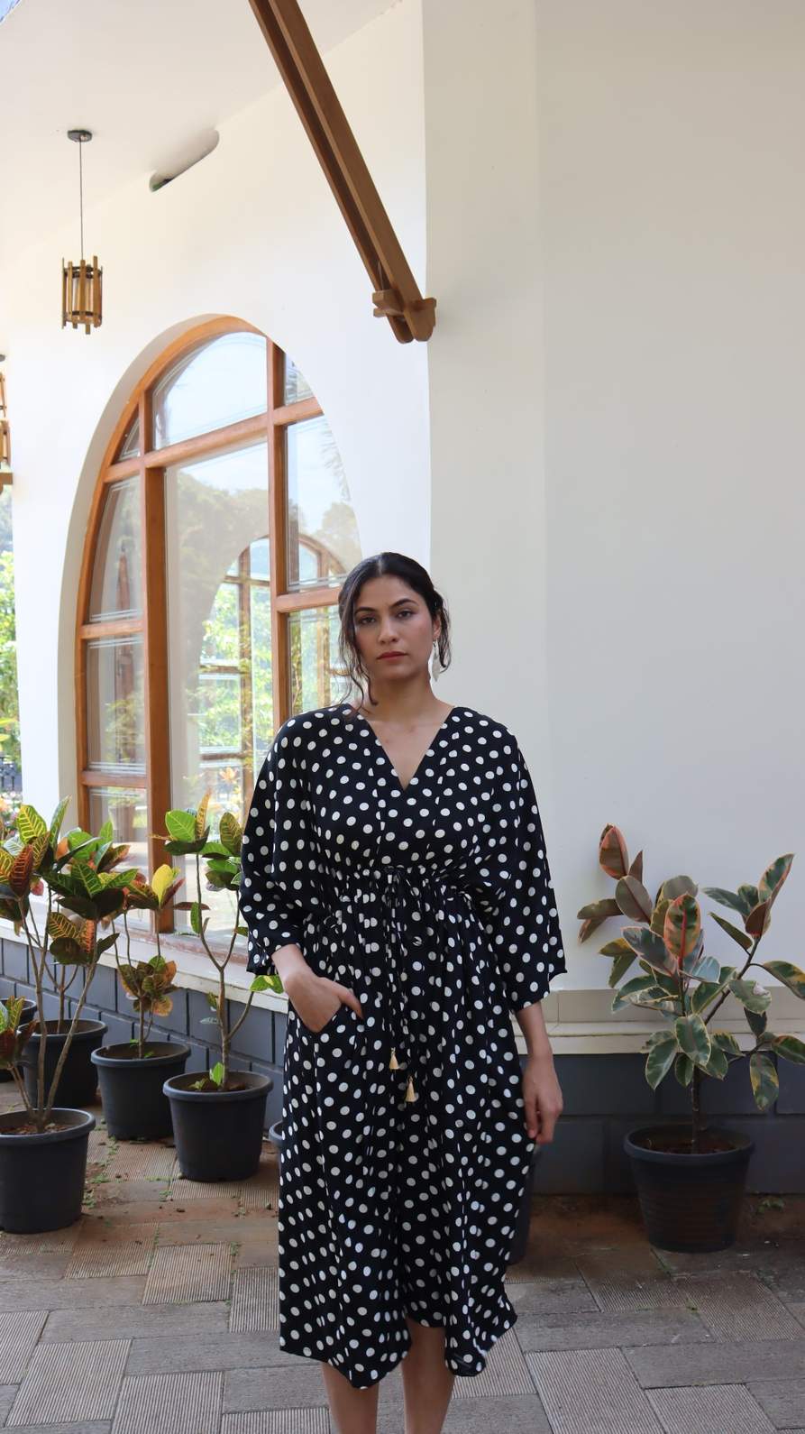 The Luna Polka Free Size Pocket Dress is a timeless everyday essential designed for effortless comfort and easy elegance. Featuring a classic black base with playful white polka dots, this dress blends vintage charm with modern wearability — perfect for warm-weather days when you want to look put together without trying too hard.