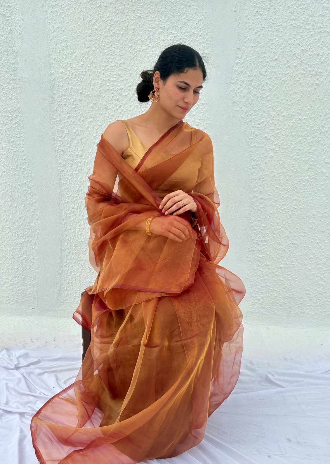 Meet Sunkissed — a gorgeous semi-organza saree that flows effortlessly with a delicate, lightweight texture. What truly makes it special is the dazzling gold shine that shimmers brilliantly, catching light at every turn to give you that radiant, sun-kissed glow.
