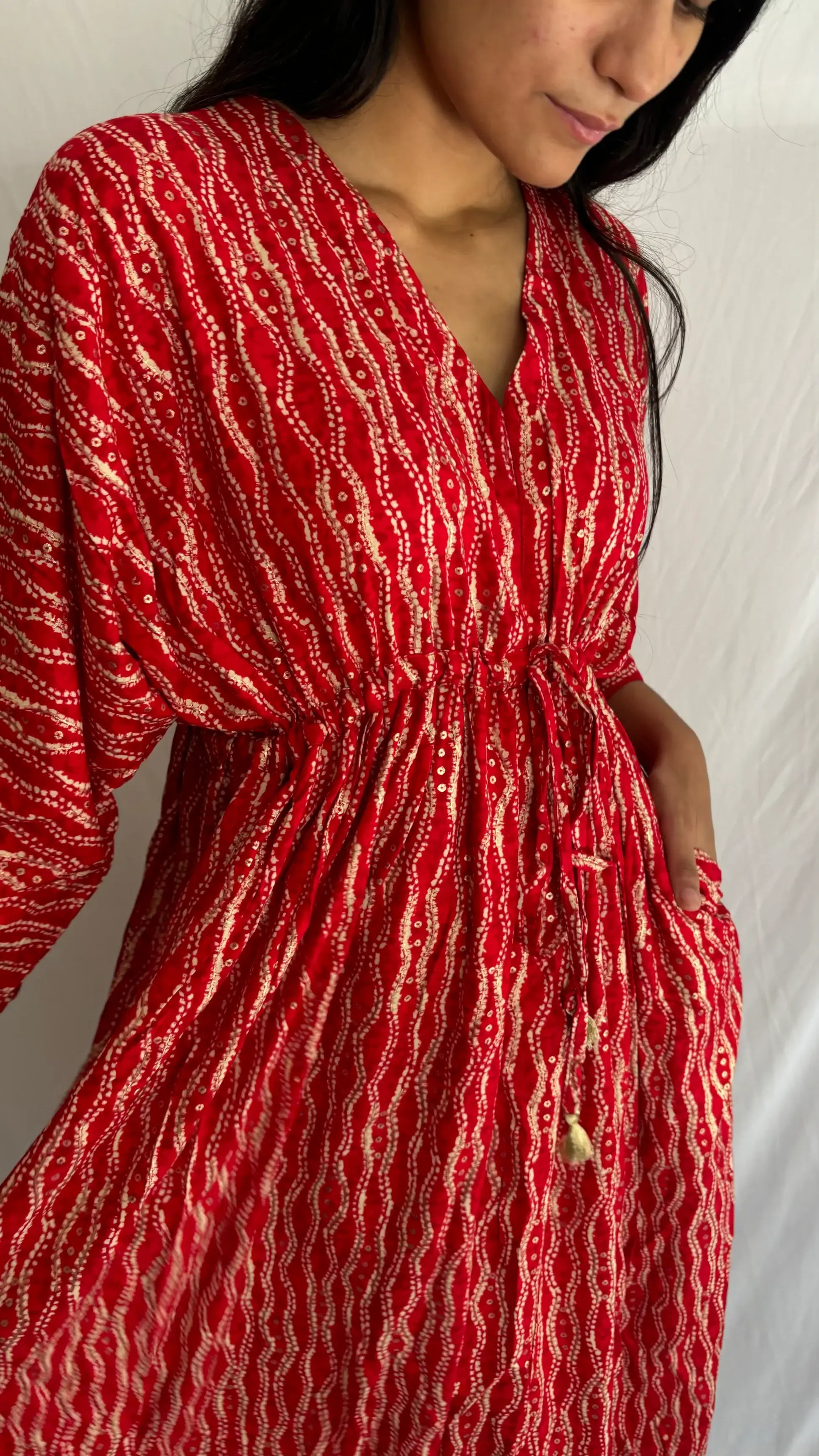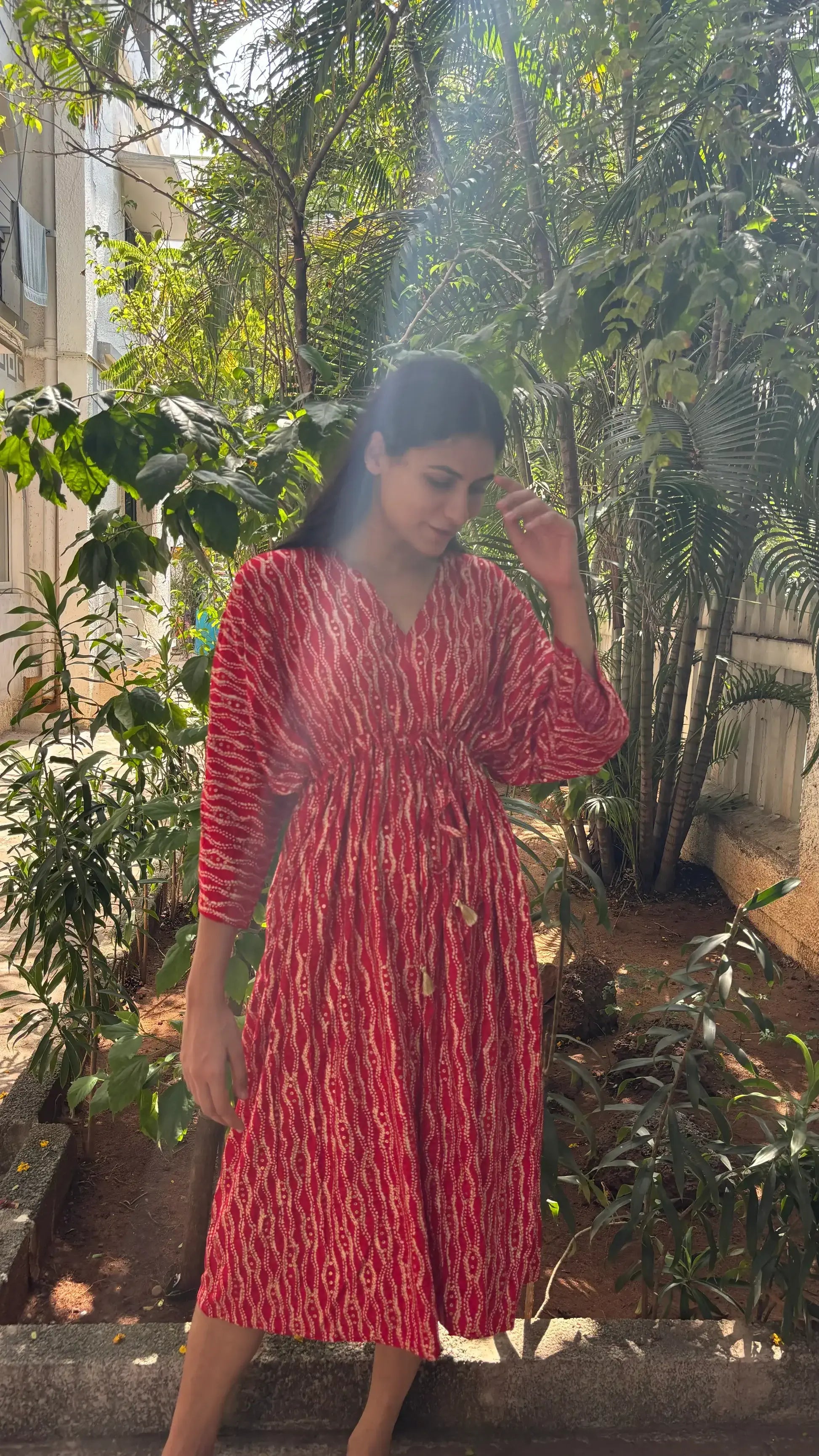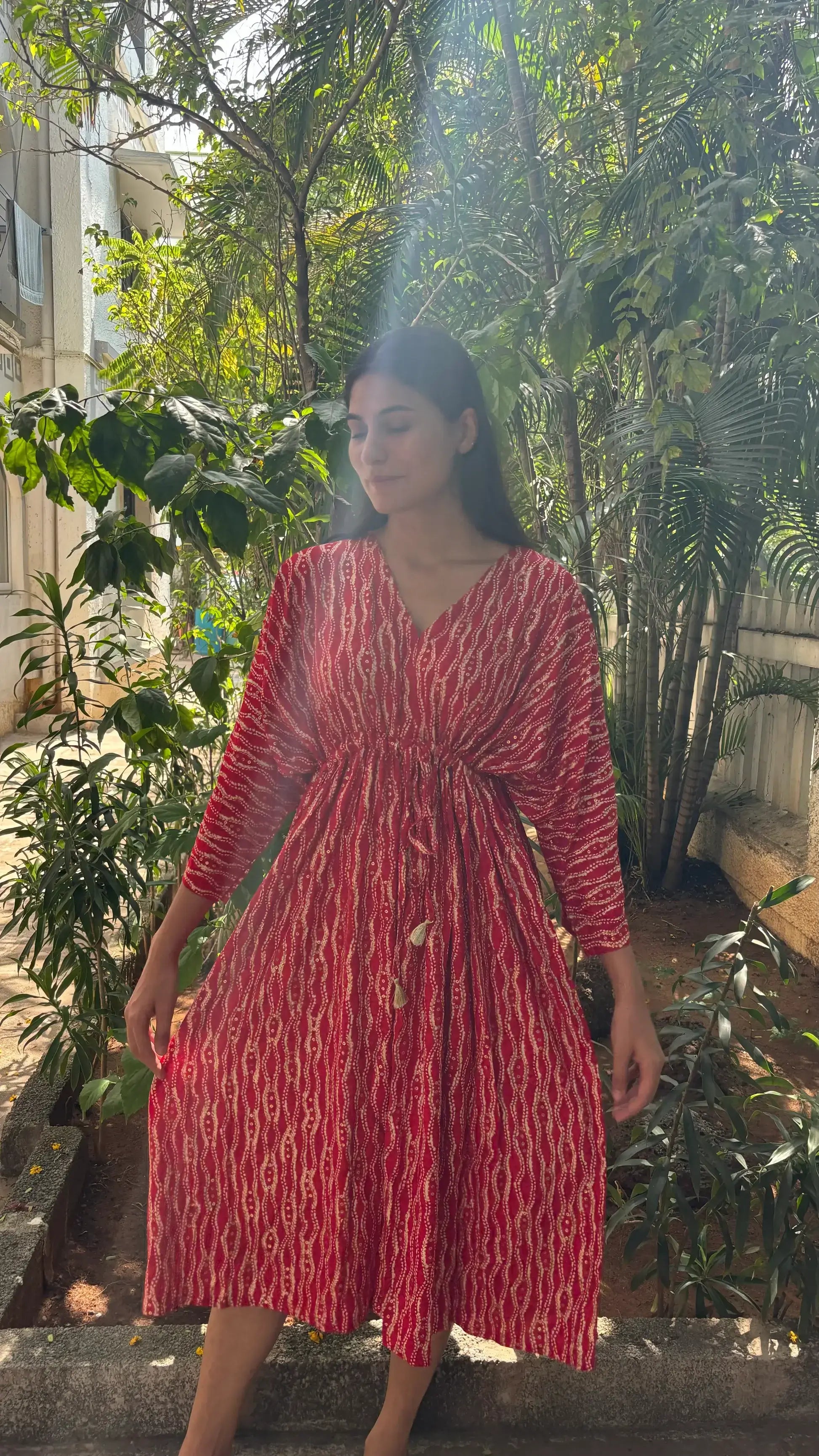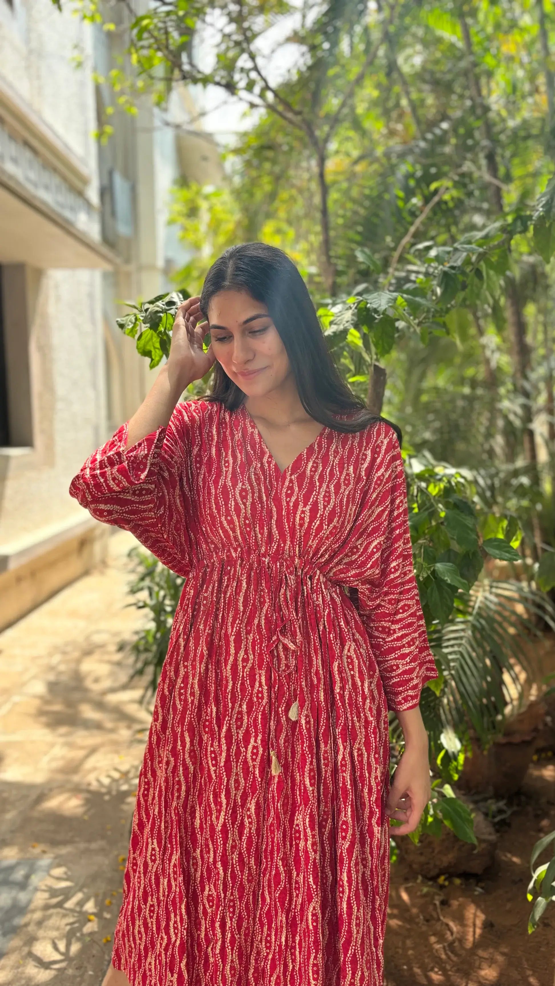 Shop the Wavy Elegance Free Size Dress featuring a stunning red design with wavy lines and playful polka dots. This stylish dress combines comfort and elegance, perfect for any occasion. Order yours today at Label Anaira!